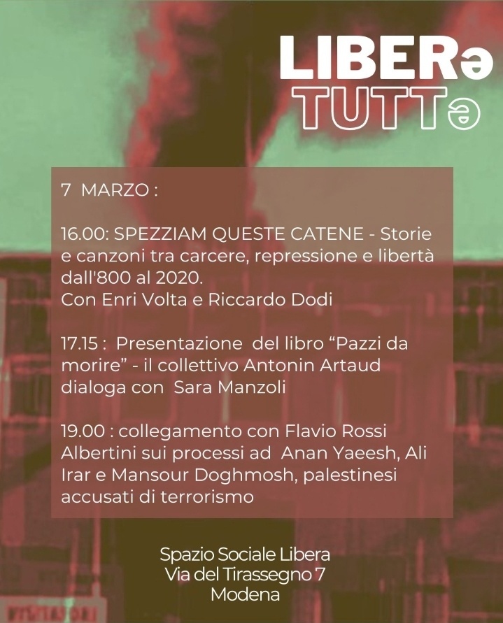 palestinamusicalibricarcereantipsichiatriacollettivo antipsichiatrico Antonin ArtaudComitato verità e giustizia per i morti de Sant'AnnadibattitoliberaLiberx tuttxlotta anticarcerariapsichiatria