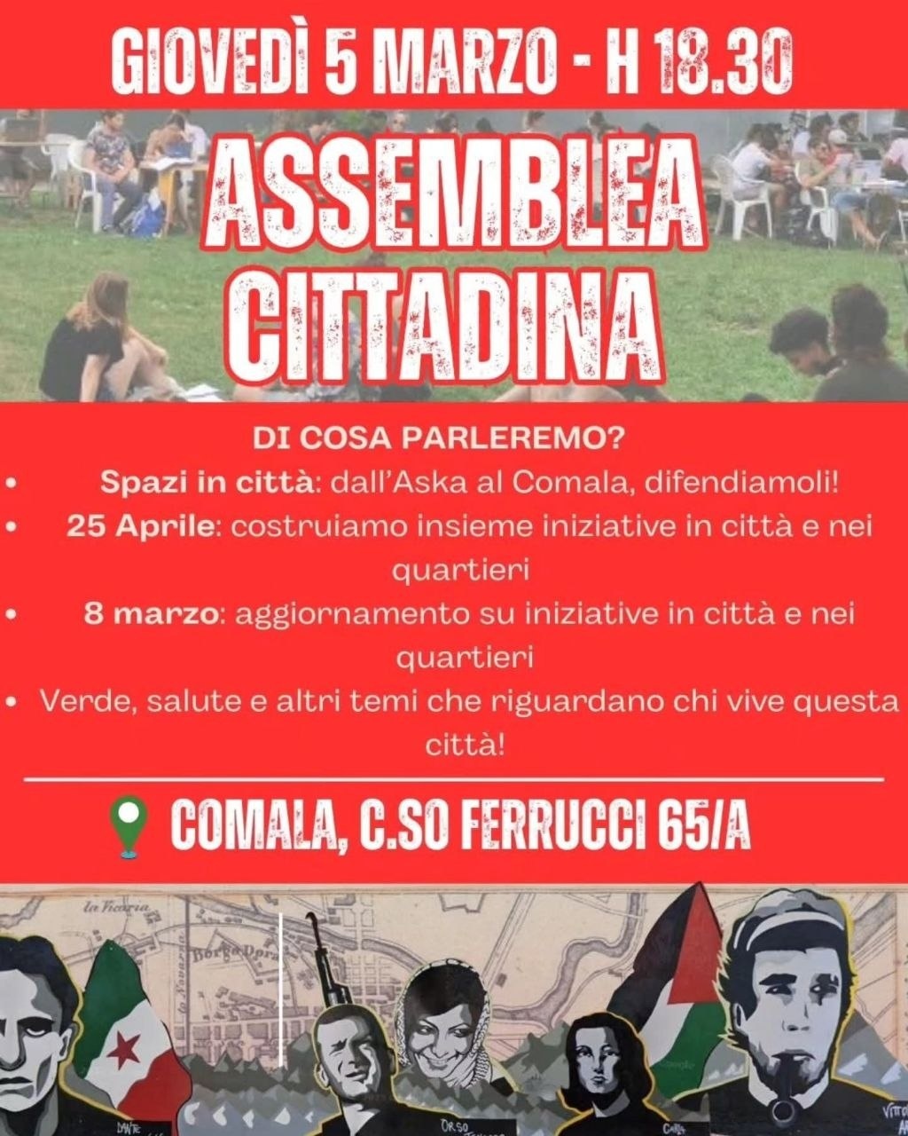 ASSEMBLEA CITTADINA Dall'Askatasuna al Comala: la piega che sembra prendere questa città è quella dell'eliminazione degli spazi non mercificati, liberi, in cui portare avanti iniziative dal basso. Difendere questi spazi e quello che rappresentano è fondamentale nel momento in cui la guerra e le sue forme invadono il nostro quotidiano. Continuare a incontrarsi per discutere e riflettere insieme è allora ancora più necessario. Tanti momenti sono alle porte per costruire insieme una Torino diversa, che non si piega alle logiche di profitto e militarizzazione. E' il momento di essere partigiani, di prendere parte per realizzare la città che vorremmo a partire dalle nostre necessità, mettendo al primo posto la salute, il verde, il clima e forti legami di solidarietà contro la violenza della guerra e quella patriarcale! Ci vediamo il 5 marzo alle 18.30 al Comala!
