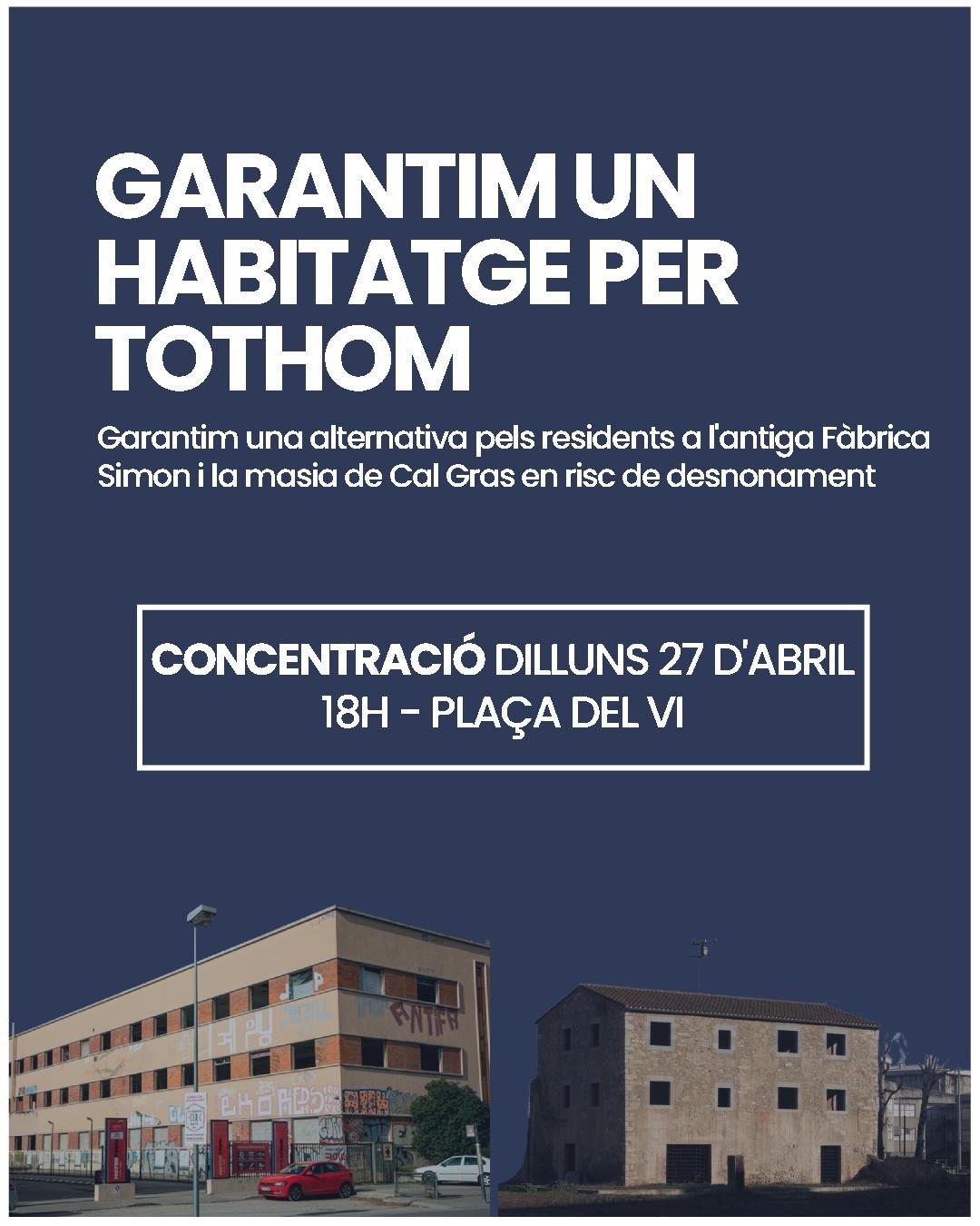 Diferents col·lectius, entitats i organitzacions de Girona impulsem aquest manifest per donar una resposta col·lectiva al desnonament de més d’un centenar de persones de l'antiga fàbrica Simon, a la carretera Barcelona, i de la masia de Cal Gras, a les hortes de Santa Eugènia.