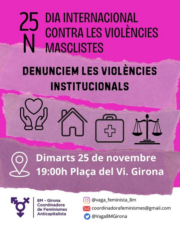 El proper dimarts 25 de novembre a Girona ens tornem a trobar per denunciar i recordar les violències masclistes que continuen assassinant, oprimint i silenciant les dones, lesbianes, trans i identitats dissidents arreu del món.
