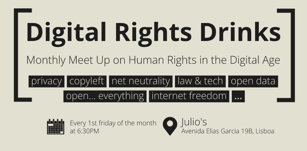 O Digital Rights Drinks é um encontro informal organizado por membros de diversas comunidades portuguesas relacionadas com tecnologia e direitos fundamentais, como a Associação D3 - Defesa dos Direitos Digitais, a PrivacyLX, a ANSOL, a Comunidade Ubuntu ou a ESOP. Não possui site oficial, redes sociais ou outro ponto de informação centralizado, mas acontece todas as 1ªs sextas-feiras de cada mês, há já alguns anos, sendo normalmente divulgado através dos canais de comunicação dessas entidades.