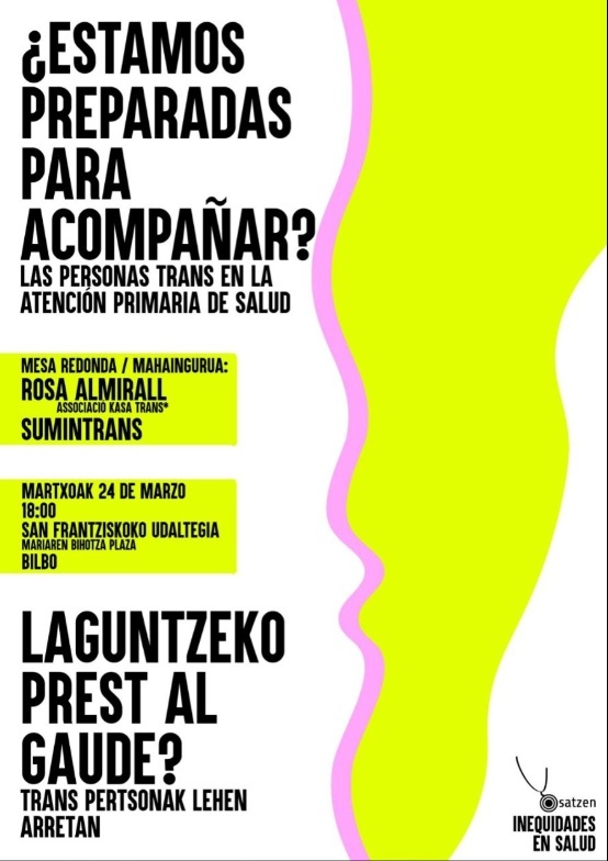 Osatzeneko Inequidades en Salud lantaldetik hurrengo mahai-ingurura gonbidatzen zaituztegu. Gaur egun pertsona transek osasun-sisteman bizi duten esperientziaz hausnartzeko eta lehen mailako arretatik arreta seguruagoa, hurbilagoa eta errespetuzkoagoa nola eskaini dezakegun elkarrekin pentsatzeko gunea izango da. Gure burua interpelatzeko, ikasteko eta benetan bidelaguna izango den arreta baterantz hurbiltzeko.