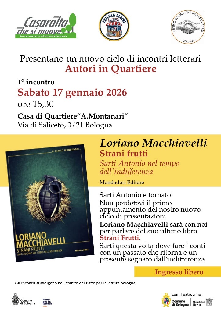 Inizia sabato 17 gennaio 2026, con la presentazione del libro STRANI FRUTTI di Loriano Macchiavelli, AUTORI IN QUARTIERE, un nuovo ciclo di incontri letterari in Bolognina.