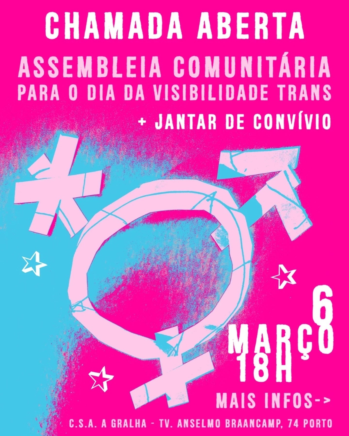 Convidamos-te a esta primeira assembleia comunitária onde começamos pela organização do dia da visibilidade trans para construir juntes um movimento que vá além de 31/03.