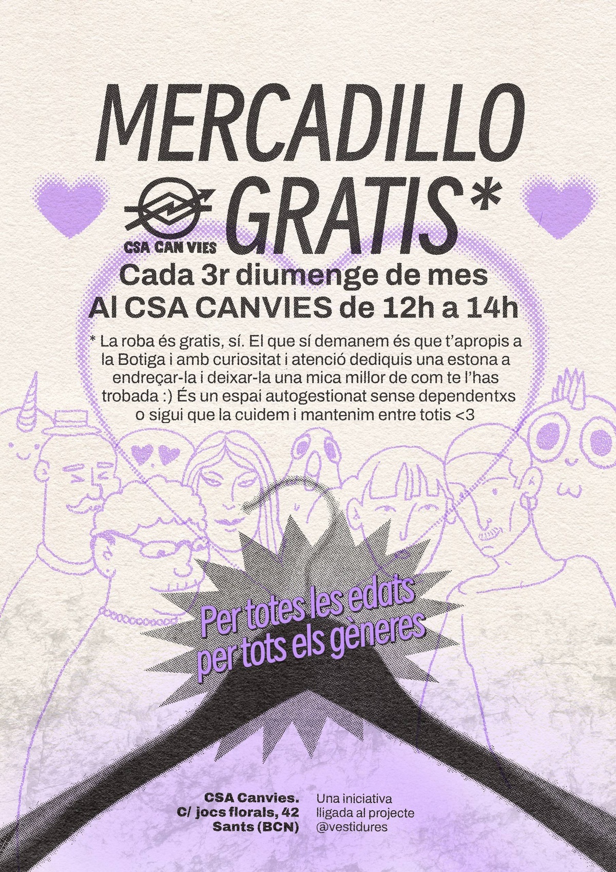 Cartell de la jornada mensual de la Botiga Gratis, enguany reanomenada com "Mercadillo gratis". Es veuen uns personatges al centre de diferents edats, estils i gèneres. També un dragonet i algun altre ésser simpàtic, com un unicorn al fons, somrient. Al mig de tot un penjador de roba, símbol de la Botiga Gratis que funciona de forma autogestionada. I uns cors de color lila als dos costats, emmarcant de forma cuqui :)