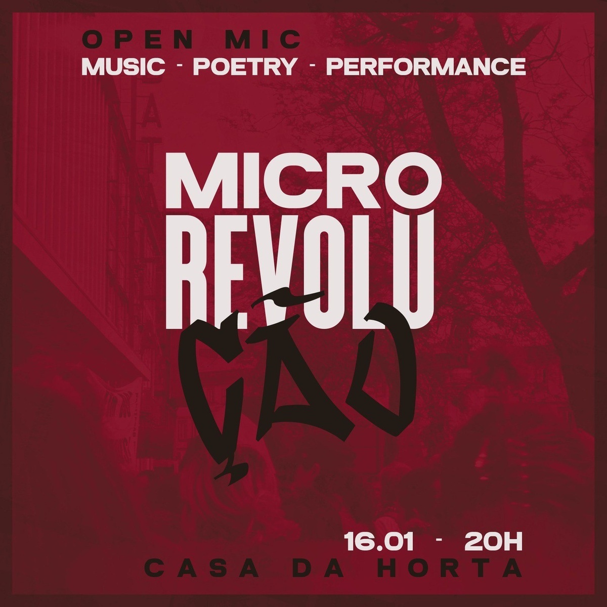 Micro Revolution is an Open-Mic that aims to share expression and individual and collective revolution through various forms of art. We believe that by creating, uniting people, cultures, ideas and different forms of art we can take a step towards collective consciousness and a proposal for a future utopia.
