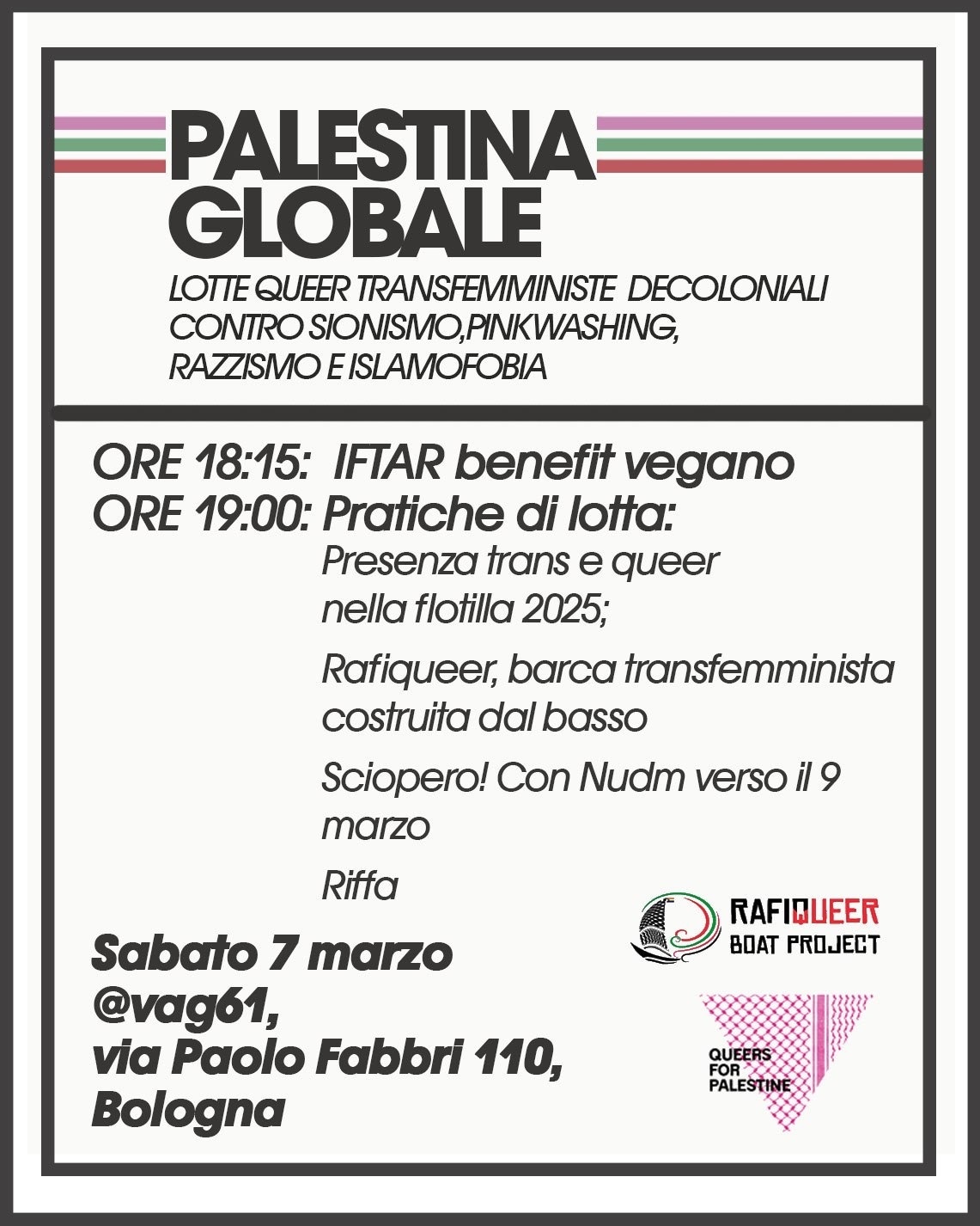 Parleremo insieme partendo dalla presenza trans e queer nella scorsa flotilla del 2025 passando al progetto della Rafi Queer, una barca transfemminista costruita dal basso verso la prossima flotilla.