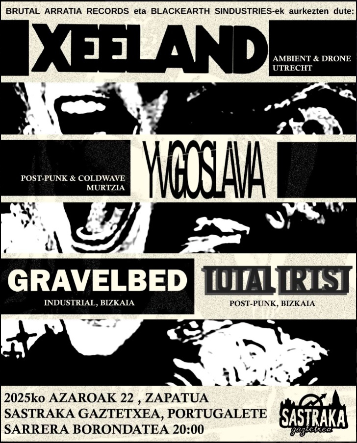 Dentro de la minigira que recorrerá el norte de Xeeland (Ambient/Drone), Yugoslavia (Coldwave) y Gravelbed (Industrial), el 22 de Noviembre harán parada en el Gaztetxe de Sastraka. En este caso tenemos de invitado especial a Total Trist (Postpunk) desde Bilbao. Postpunk y oscuridad con visuales correrán a cargo de la inigualable Camile Duhart